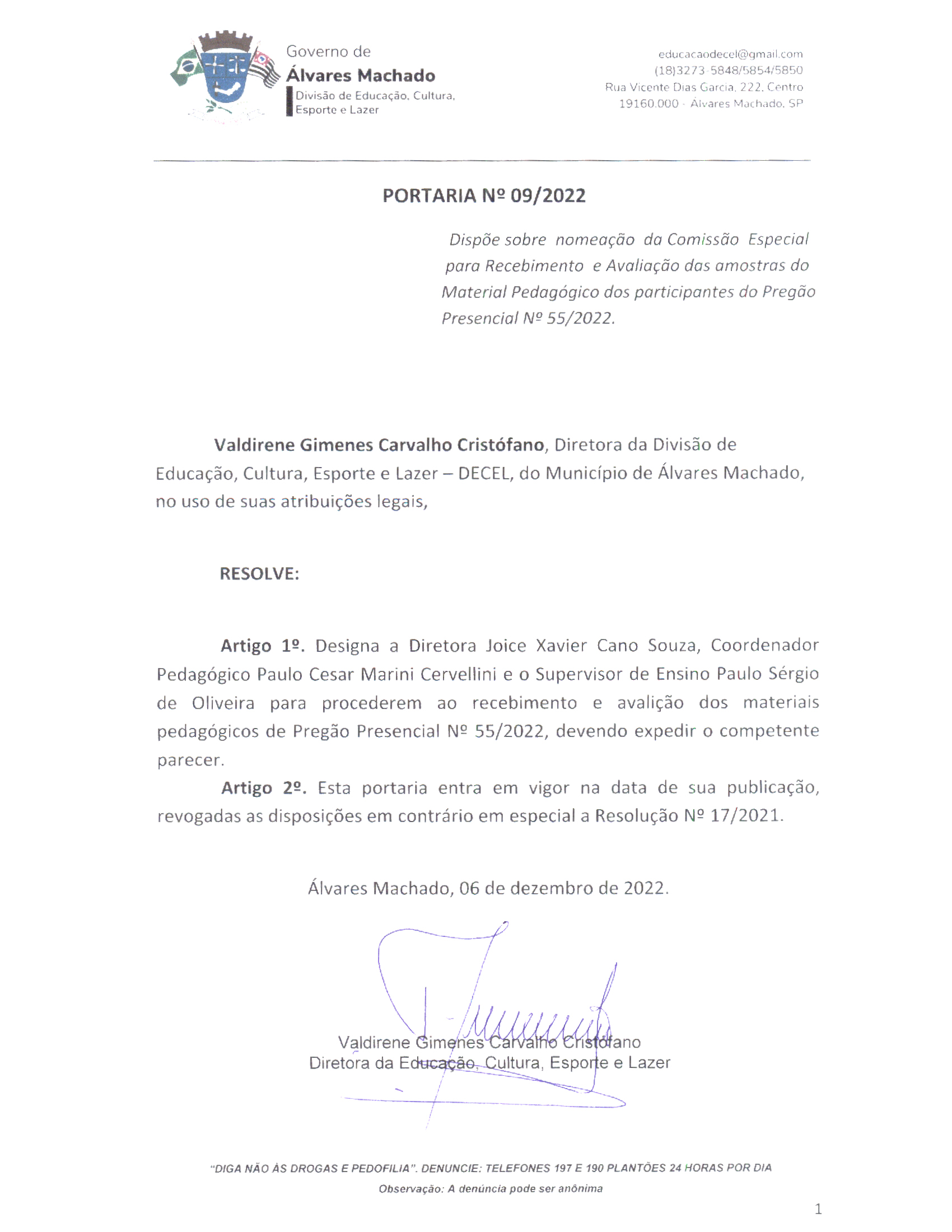 Dispõe sobre a nomeação da comissão Especial para Recebimento e Avaliação das amostras do Material pedagógico dos participantes do Pregão Presencial Nº 55/2022.