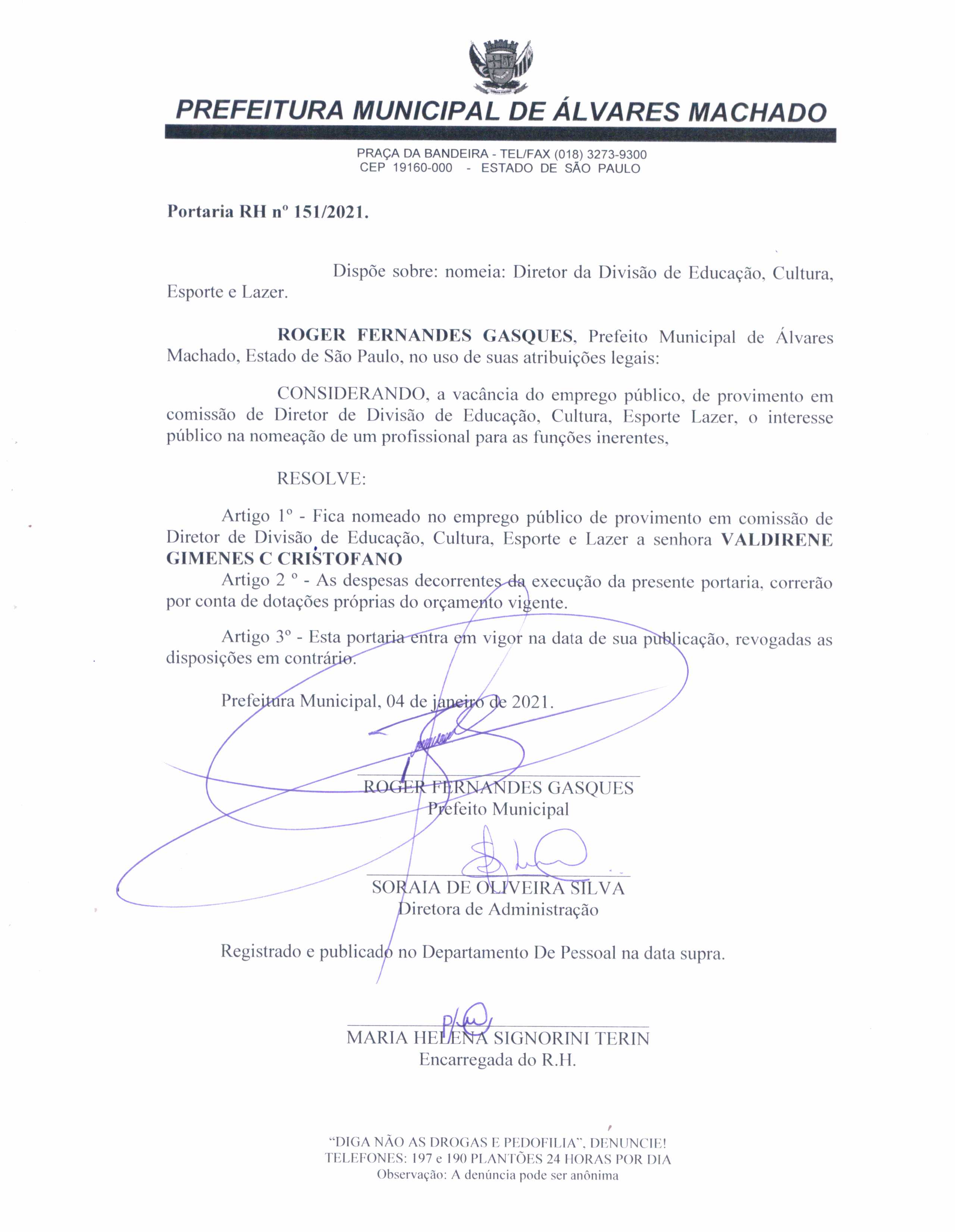 Portaria de Nomeação de Valdirene Gimenes Carvalho Cristófano como Diretora de Educação, Cultura, Esporte e Lazer.